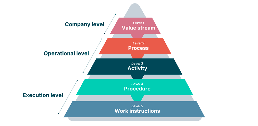 Level 1:  End-to-end scope and list of services of the organization  Examples: Procurement/ Manufacturing